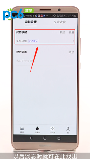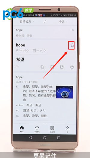 4.我们再点击右下方的灰框按钮就可以将整段放大,按左下方的喇叭就能识读,更易记住。点击星状标点,就能将其纳入底部的【收藏夹】,以后淡忘时就可在此找出,把不太详熟的词句汇在这里,学得更快。