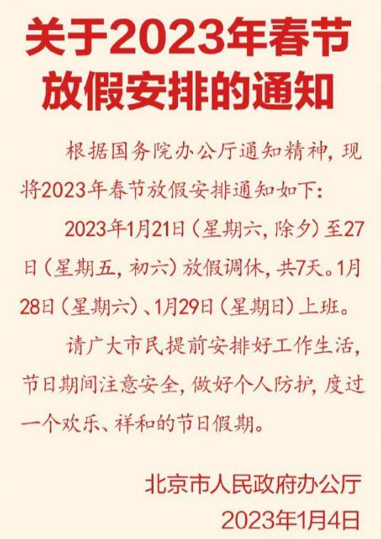【今年春节放七天上七天】1月4日,北京市人民政府办公厅发布《关于2023年春节放假安排的通知》(以下简称《通知》)。《通知》指出,根据国务院办公厅通知精神,现将2023年春节放假安