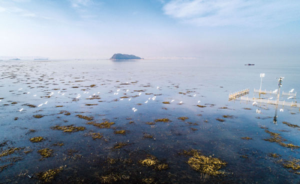 江西九江,一群候鸟在鄱阳湖江西都昌县矶山附近的湿地上栖息、觅食。图/视觉中国