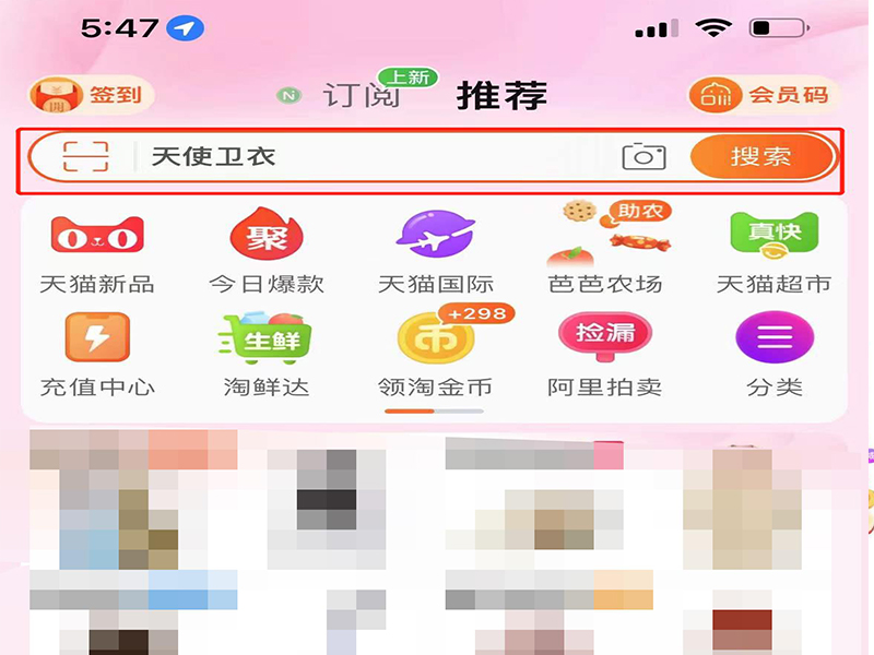 1、打开淘宝app,在首页上点击搜索框,进入搜索页面。