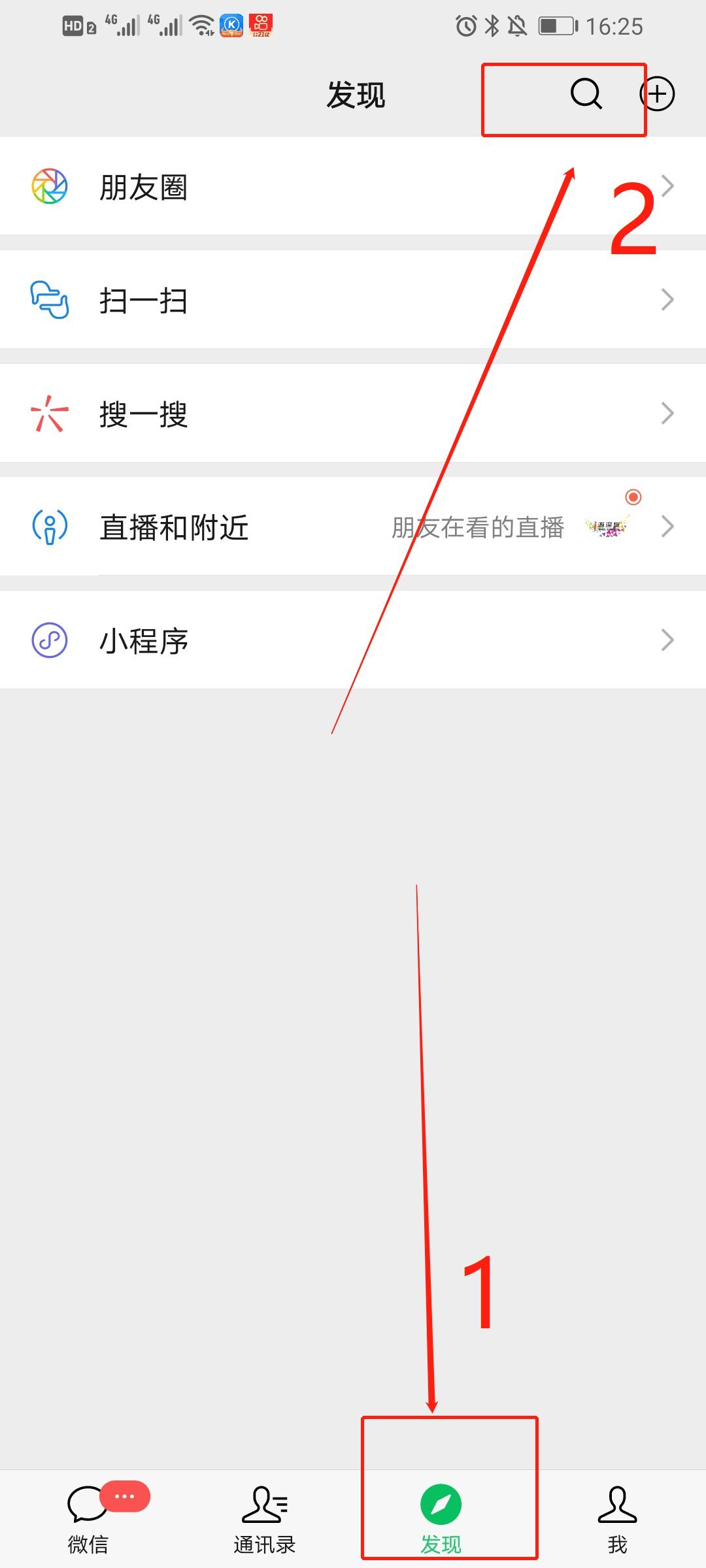 第一步:在微信里面,点击页面下方的菜单栏中的“发现”,接着点击页面上方的”搜索“图标(如下图所示);