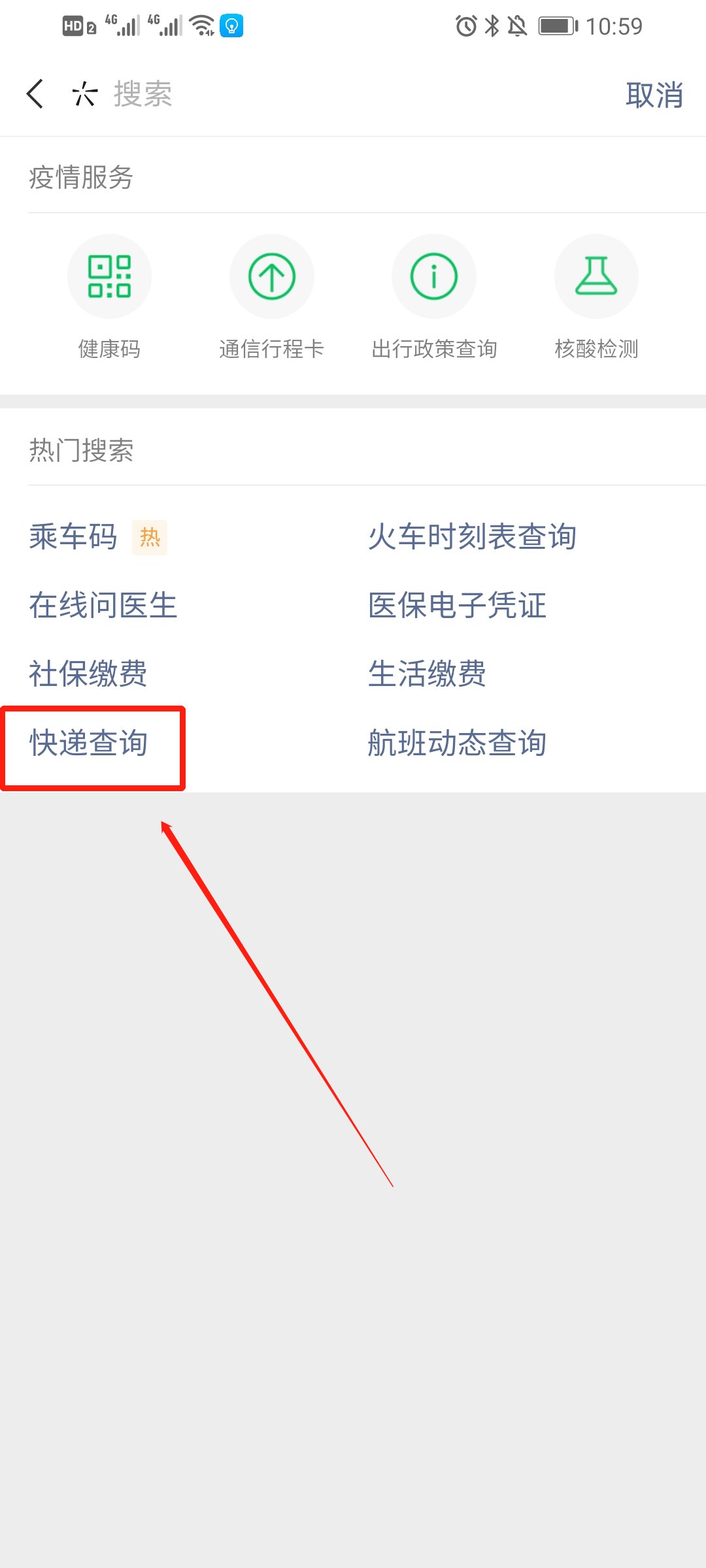 第三步:然后进入,点击热门搜索下方的“快递查询”(如下图所示);