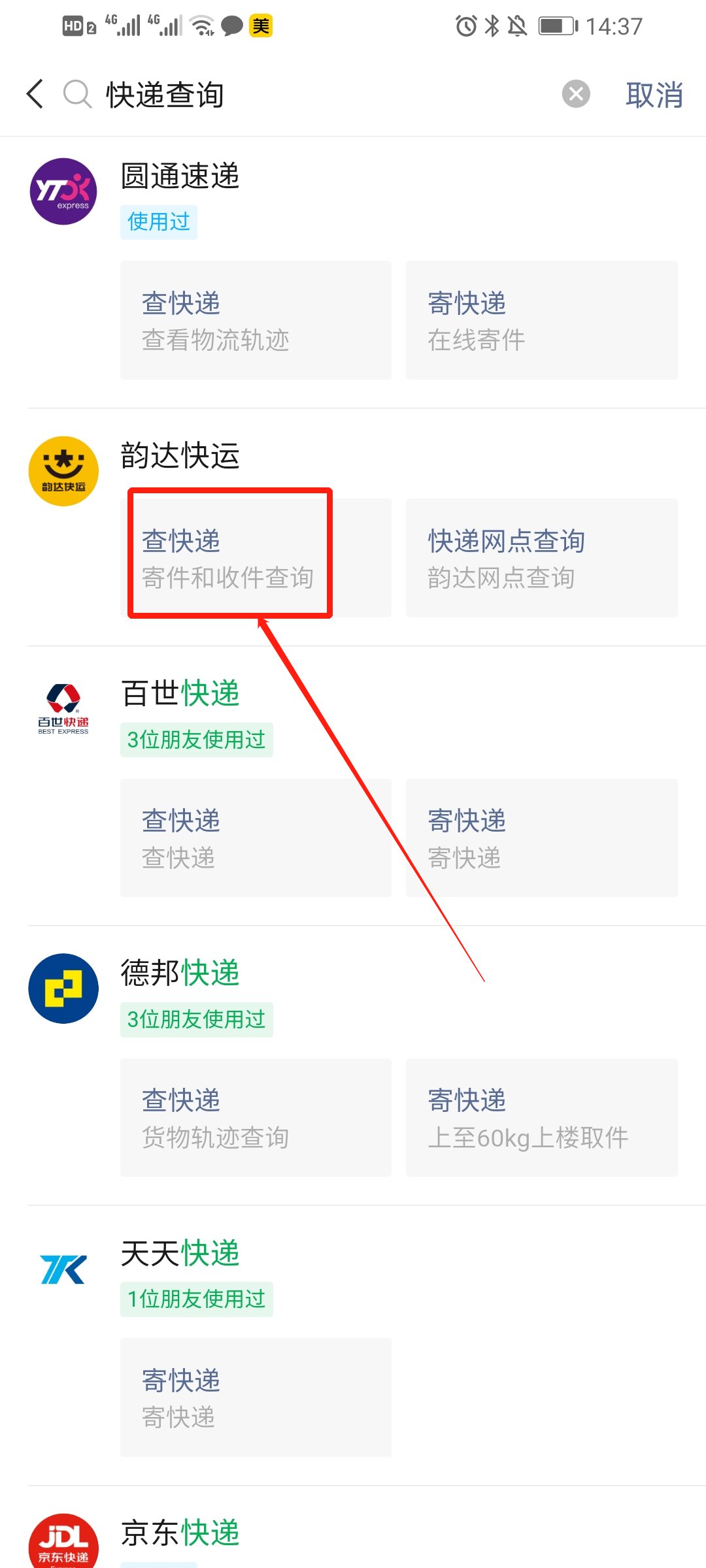 第四步:然后进入,在服务下方找到“韵达快运”接着点击“查快递”(如下图所示);