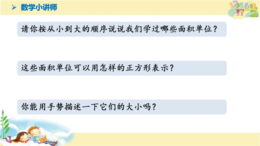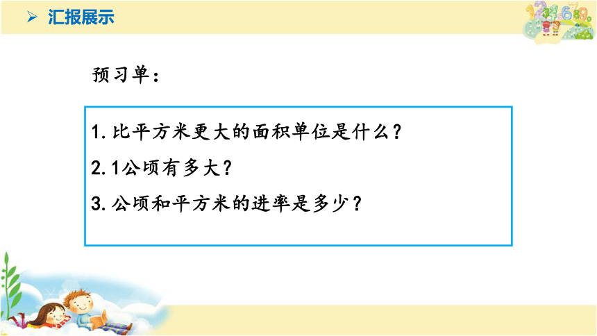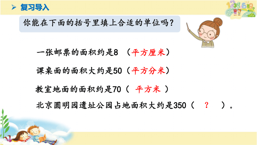 大致详情:(共26张PPT)认识公顷苏教版小学数学五年级(上册)数学小讲师请你按从小到大的顺序说说我们学过哪些面积单位?这些面积单位可以用怎样的正方形表示?你能用手势描述一下它们的大小吗?复习导入你能在下面的括号里填上合适的单位吗?一张邮票的面积约是8 ( )课桌面的面积大约是50( )教室地面的面积约是70( )平方厘米平方分米平方米北京圆明园遗址公园占地面积大约是350( )。?汇报展示1.比平方米更大的面积单位是什么?2.1公顷有多大?3.公顷和平方米的进率是多少?预习单:探究新知北京圆明园遗址公园占...
