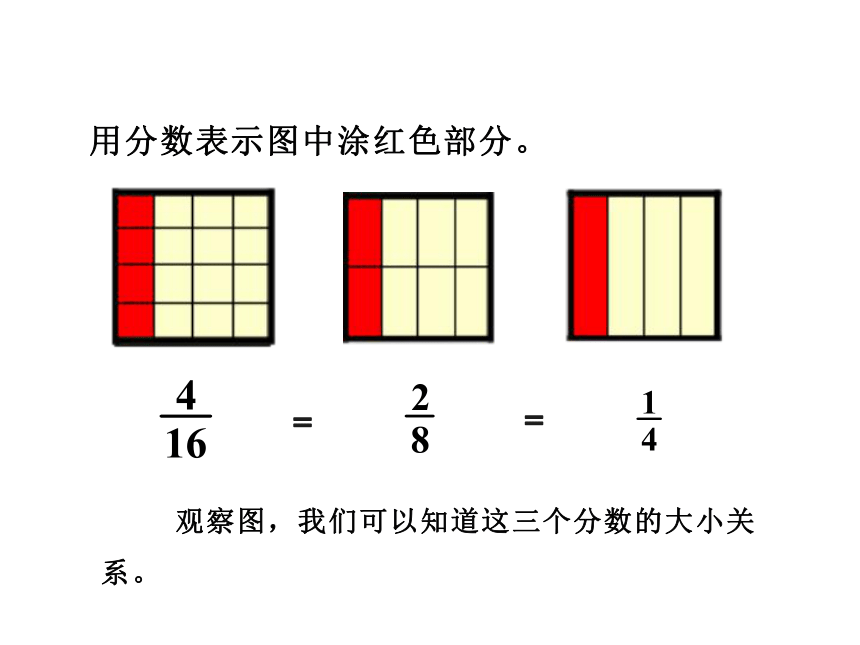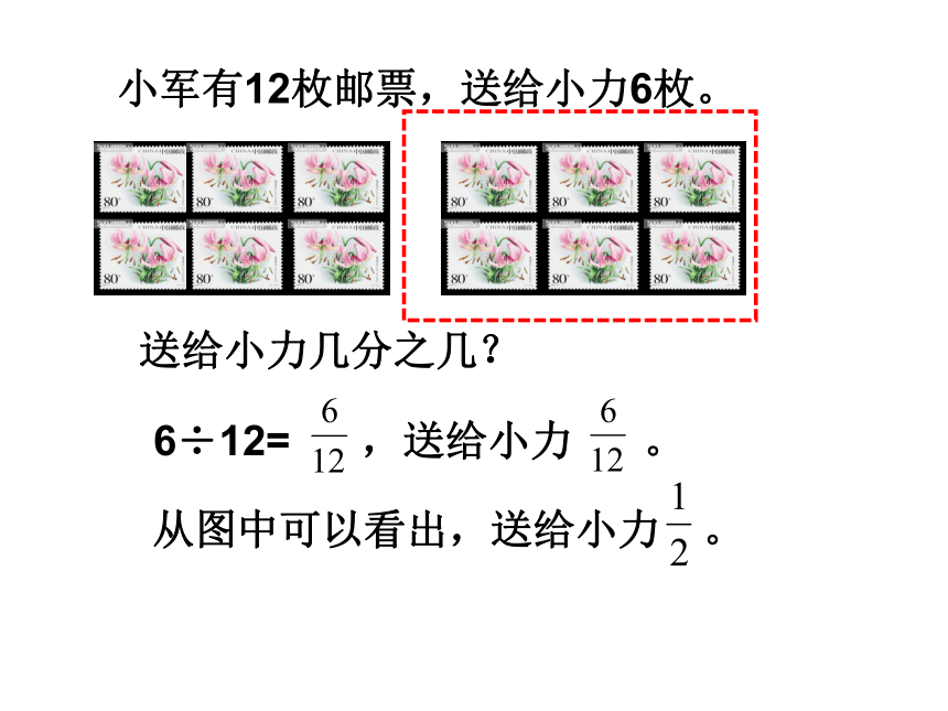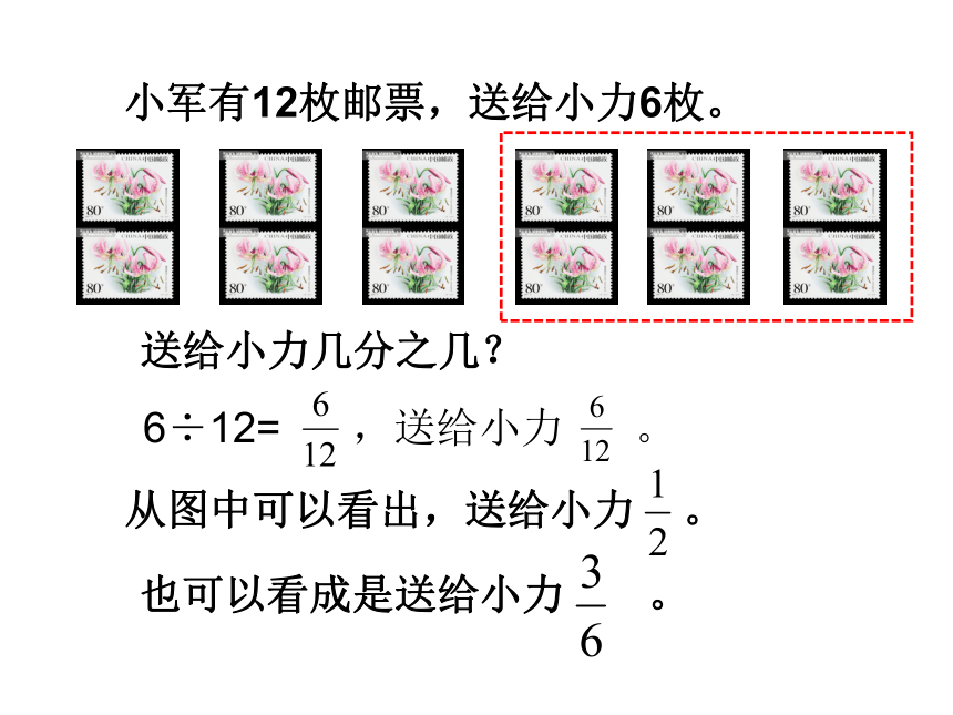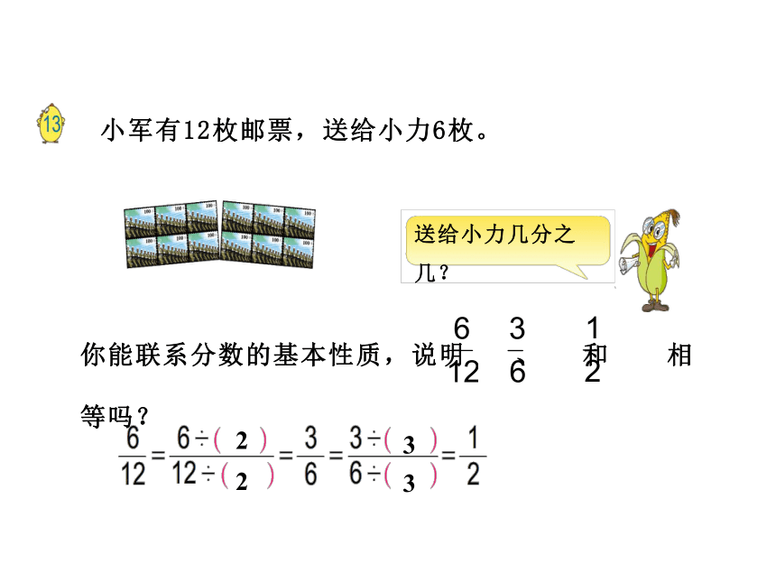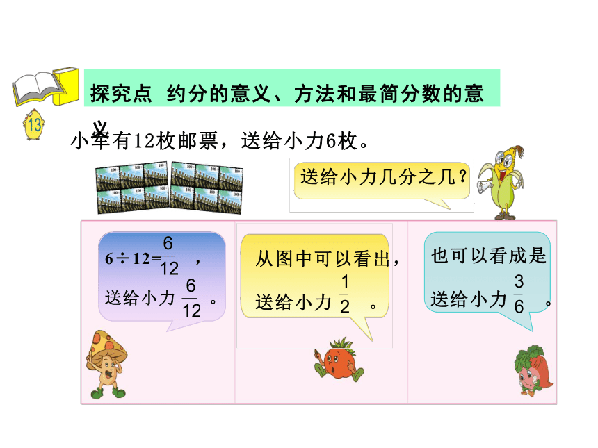 大致详情:(共27张PPT)约分五年级下册四 分数的意义和性质﹦﹦用分数表示图中涂红色部分。观察图,我们可以知道这三个分数的大小关系。小军有12枚邮票,送给小力6枚。送给小力几分之几?6÷12= ,送给小力 。从图中可以看出,送给小力 。也可以看成是送给小力 。探究点 约分的意义、方法和最简分数的意义小军有12枚邮票,送给小力6枚。送给小力几分之几?你能联系分数的基本性质,说明 、 和 相等吗?2233像这样,把一个分数化成同它相等,但分子,分母都比较小的分数,叫作约分。约分时...