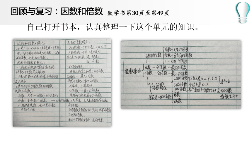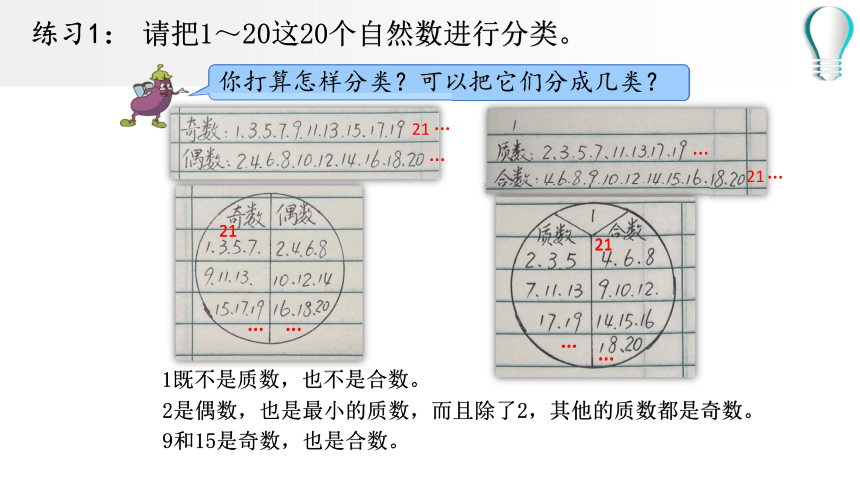 大致详情:(共15张PPT)期中复习(2)苏教版义务教育教科书数学五年级下册课前须知:1.在一个相对安静的环境下开始学习。2.整理桌面,准备好数学书、练习本和必要的文具。3.需要思考时请及时按下暂停键,给自己留出充分的时间。4.调整好自己的学习状态,积极思考,及时笔记。回顾与复习:因数和倍数数学书第30页至第49页自己打开书本,认真整理一下这个单元的知识。请把1~20这20个自然数进行分类。练习1:你打算怎样分类?可以把它们分成几类?2121…………1既不是质数,也不是合数。2是偶数,也是最小的质数,而且除了2,其他的质数都是奇数。9和15是奇数,也是合数。...