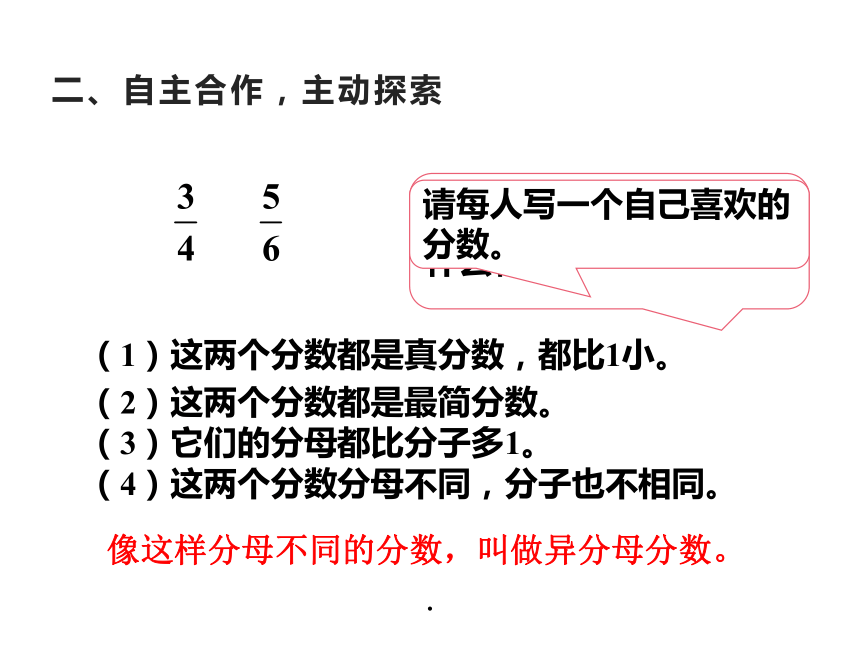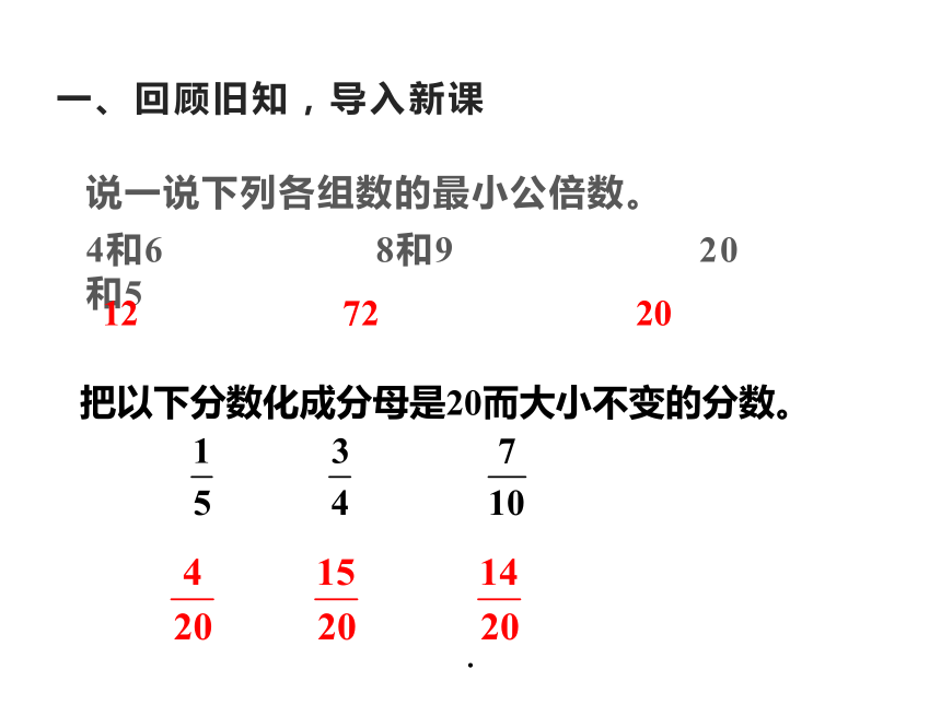 大致详情:(共15张PPT)通分苏教版五年级数学下册一、回顾旧知,导入新课说一说下列各组数的最小公倍数。4和6 8和9 20和5把以下分数化成分母是20而大小不变的分数。127220二、自主合作,主动探索观察一下,这两个分数有什么特点?请每人写一个自己喜欢的分数。(3)它们的分母都比分子多1。(4)这两个分数分母不同,分子也不相同。(1)这两个分数都是真分数,都比1小。(2)这两个分数都是最简分数。像这样分母不同的分数,叫做异分母分数。把 和 改写成分母相同而大小不变的分数。刚...