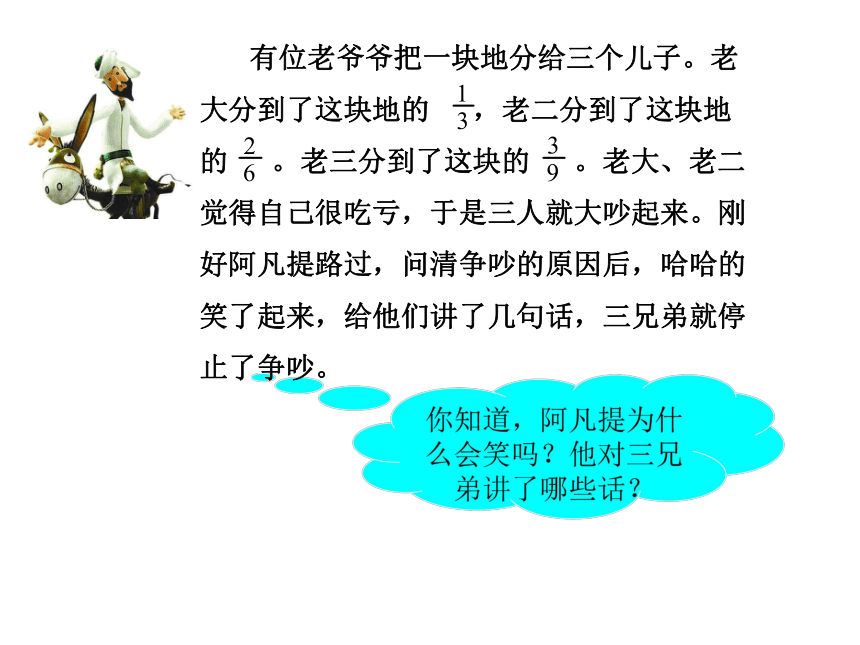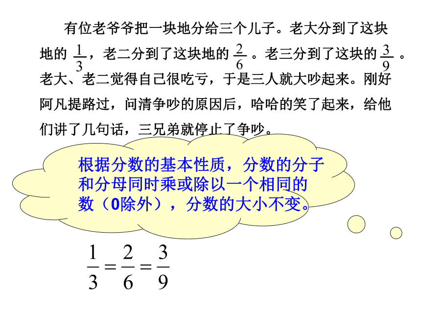 大致详情:(共18张PPT)约 分有位老爷爷把一块地分给三个儿子。老大分到了这块地的 ,老二分到了这块地的 。老三分到了这块的 。老大、老二觉得自己很吃亏,于是三人就大吵起来。刚好阿凡提路过,问清争吵的原因后,哈哈的笑了起来,给他们讲了几句话,三兄弟就停止了争吵。有位老爷爷把一块地分给三个儿子。老大分到了这块地的 ,老二分到了这块地的 。老三分到了这块的 。老大、老二觉得自己很吃亏,于是三人就大吵起来。刚好阿凡提路过,问清争吵的原因后,哈哈的笑了起来,给他们讲了几句话,三兄弟就停止了争吵。根据分数的基本性质,分数的分子和分母同时乘...