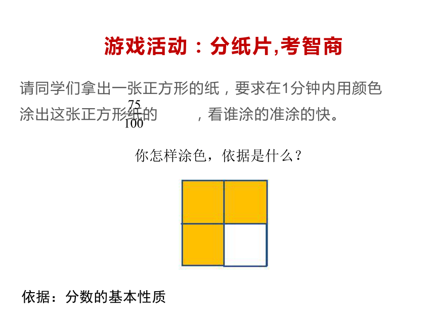 大致详情:(共16张PPT)苏教版五年级下册约分温故知新1、判断下面的等式是否成立,并说说你的依据。根据 分数的基本性质,我们可以知道等式成立游戏活动:分纸片,考智商请同学们拿出一张正方形的纸,要求在1分钟内用颜色涂出这张正方形纸的 ,看谁涂的准涂的快。你怎样涂色,依据是什么?依据:分数的基本性质在我们学习分数的过程中,有的时候我们需要根据分数的基本性质,把一个分数化成大小不变,但是分子、分母都比较小的分数,达到简洁明了的目的,这就是我们今天要学习的新内容:约分。小军有12枚邮票,送给小力6枚。送给小力几分之几?你是怎样理解“送给小力几分之几”的?送给小力几分之几...
