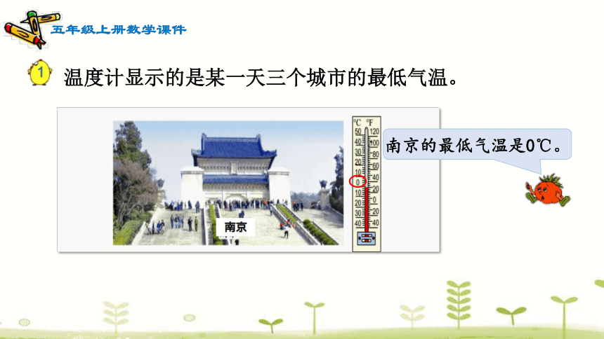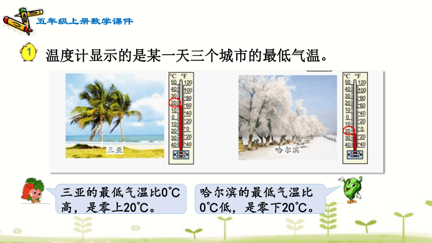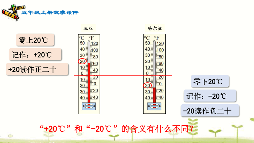 大致详情:(共26张PPT)认识负数五年级上册数学课件温度计显示的是某一天三个城市的最低气温。南京的最低气温是0℃。五年级上册数学课件温度计显示的是某一天三个城市的最低气温。三亚的最低气温比0℃高,是零上20℃。哈尔滨的最低气温比0℃低,是零下20℃。五年级上册数学课件三亚哈尔滨零上20℃记作:+20℃+20读作正二十零下20℃记作:-20℃-20读作负二十“+20℃”和“-20℃”的含义有什么不同?五年级上册数学课件你能看图说出珠穆朗玛峰和吐鲁番盆地比海平面高或低多少米吗?8844.4m155m五年级上册数学课件0米8844.4m海拔8844.4米,...