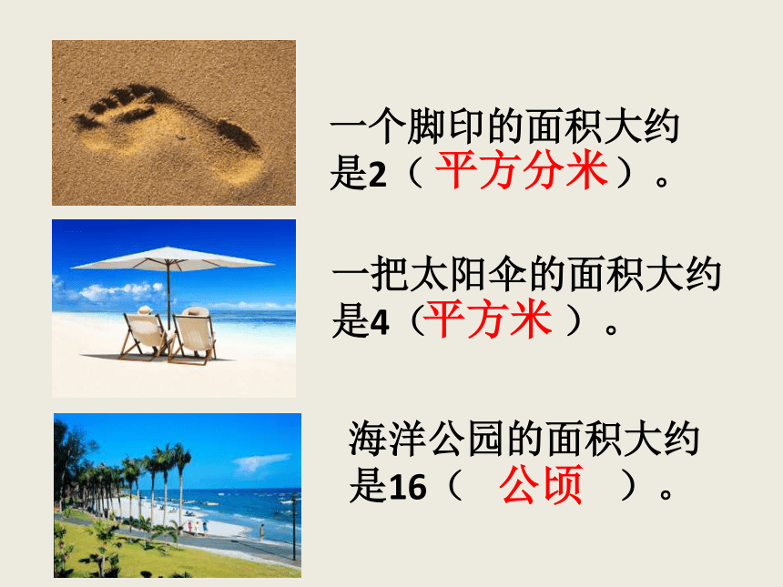 大致详情:(共22张PPT)认 识 公 顷苏教版五年级数学上册一个脚印的面积大约是2( )。一把太阳伞的面积大约是4( )。海洋公园的面积大约是16( )。平方分米平方米公顷金山公园占地41公顷大港银山公园占地7公顷计量土地面积,通常用公顷作单位。请你估计一下:学校大约有( )公顷操场的面积大约有14000平方米,和1公顷相比,6100个这样的正方形面积大约是1公顷。10000 ÷100=100(个)10×10=100(平方米)一个...