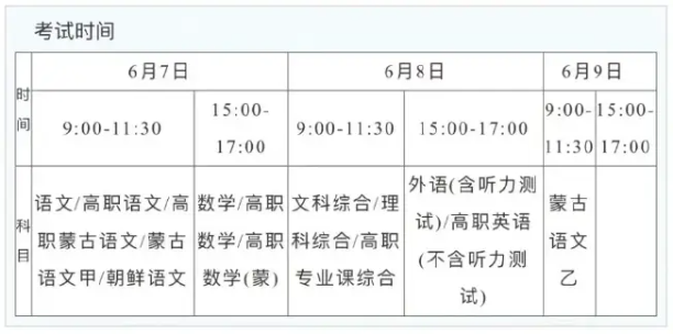 高考时间:6月7日-6月9日。(黑龙江、辽宁等地区会在6月10日进行民族语文考试)