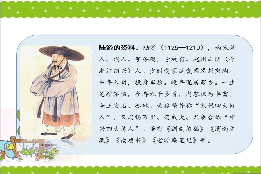陆游是南宋爱国诗人,面临祖国分裂的剧变时代,早怀报国大志,中年从军西南,壮阔的现实世界、热烈的战地生活,使他的诗歌境界大为开阔。全诗表达了诗人对中原沦丧的无限愤慨,对广大民众命运的无限关切,对南宋统治集团苟安误国的无限痛恨。