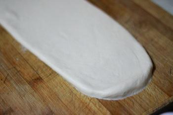 5、将面团擀成长方型形状态,厚度约为1cm左右