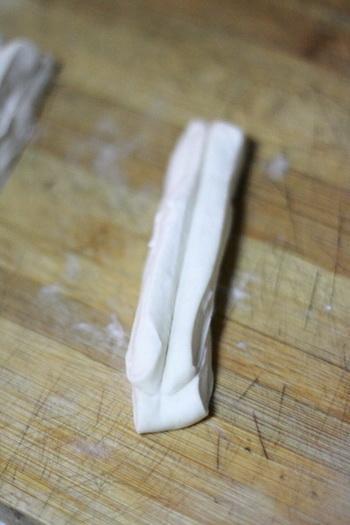 7、将两个小条叠放在一起,用筷子在中间上纵向轻下一下