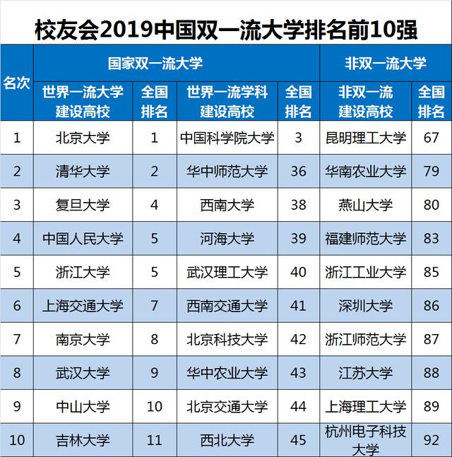 在校友会2019中国大学排名中,全国87所双一流大学跻身百强行列,100所荣膺2019中国五星级(5★)以上大学;北京大学、清华大学、复旦大学位列2019世界一流大学建设高校排行榜前3强;中国科学院大学、华中师范大学、西南大学位列2019世界一流学科建设高校排行榜前3强。昆明理工大学、华南农业大学和燕山大学问鼎2019中国非双一流大学排名前3强,是2020年国家“双一流”增选的最有力竞争者。
