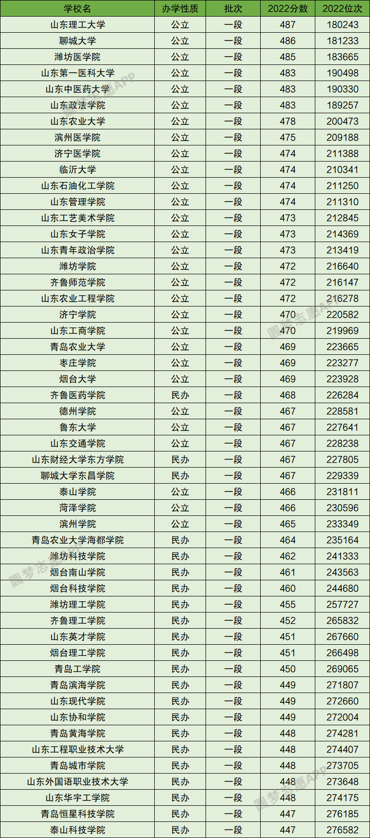 圆梦志愿为大家整理了2022年山东所有二本大学的分数线及位次,可以看出山东中分数最高实力最好的二本大学是山东理工大学,2022年在山东最低分为487分,山东全省最低位次为180243。