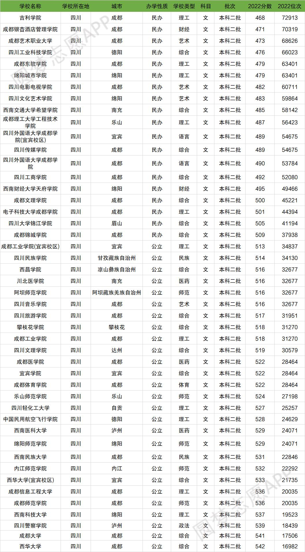 吉利学院(468分)、成都银杏酒店管理学院(471分)、成都艺术职业大学(473分)、四川工业科技学院(476分)、成都东软学院(479分)、绵阳城市学院(479分)、四川电影电视学院(482分)、四川文化艺术学院(483分)、西南交通大学希望学院(485分)、成都理工大学工程技术学院(487分),以下为2022年四川省文科所有二本大学分数线。